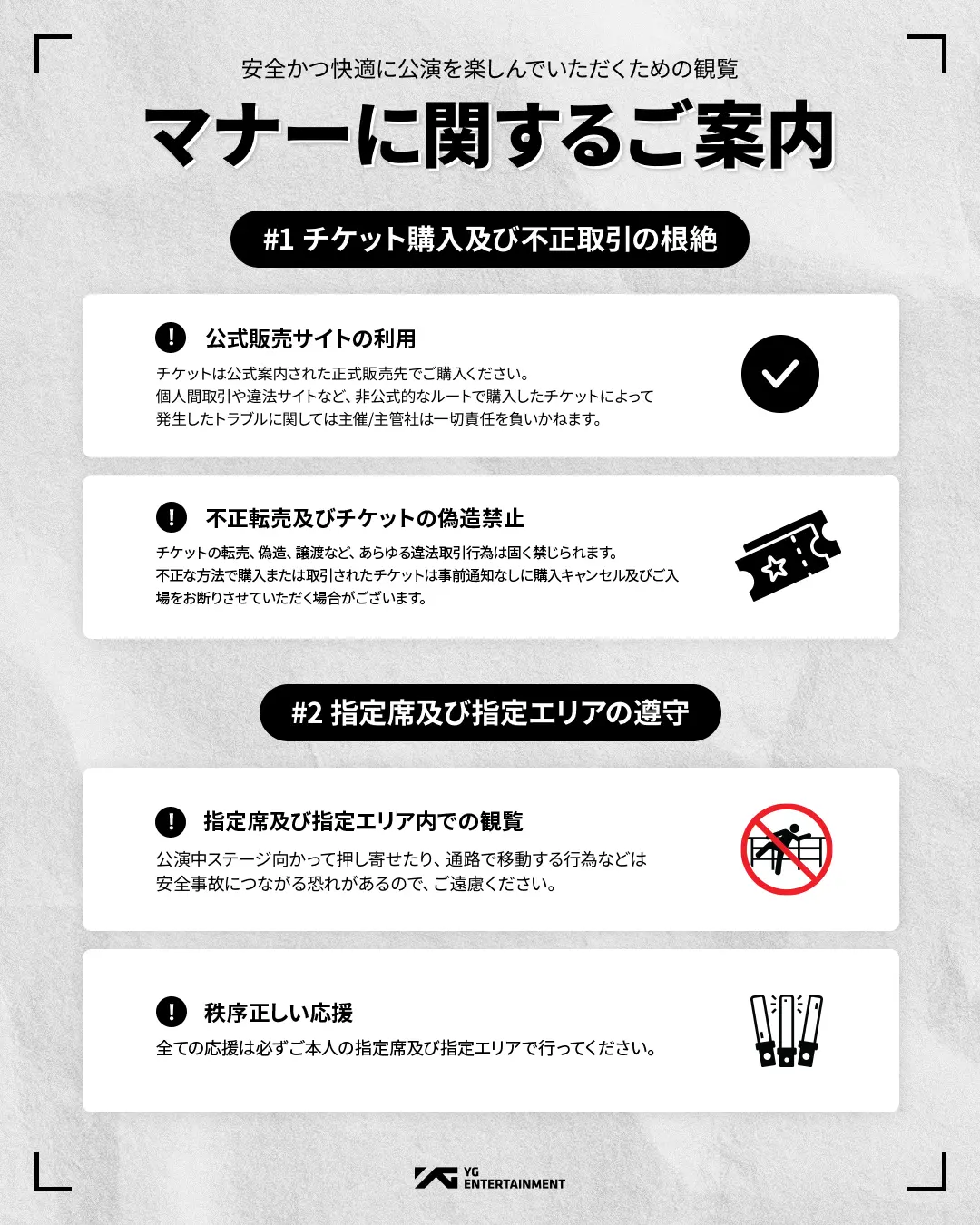 個人間取引や違法サイトなど、非公式的なルートで購入したチケットによって発生したトラブルに関しては主催/主管社は一切責任を負いかねます。