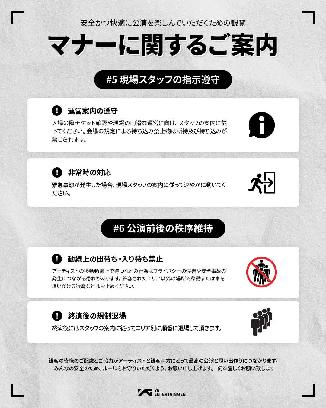 観客の皆様のご配慮とご協力がアーティストと観客両方にとって最高の公演と思い出作りにつながります。